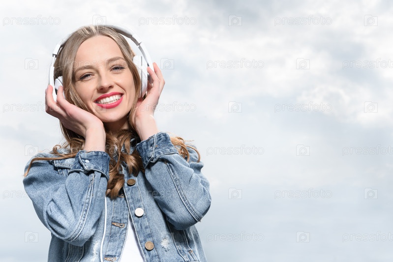 Портрет молодой улыбающейся женщины в наушниках под небом
