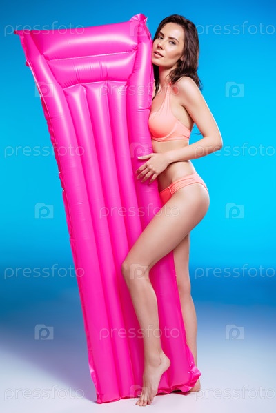 Красивая брюнетка в бикини позирует с надувным матрасом и глядя на камеру
