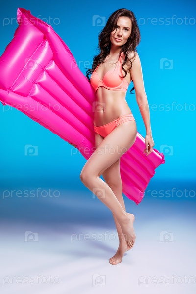 Красивая брюнетка в бикини позирует с надувным матрасом и глядя на камеру