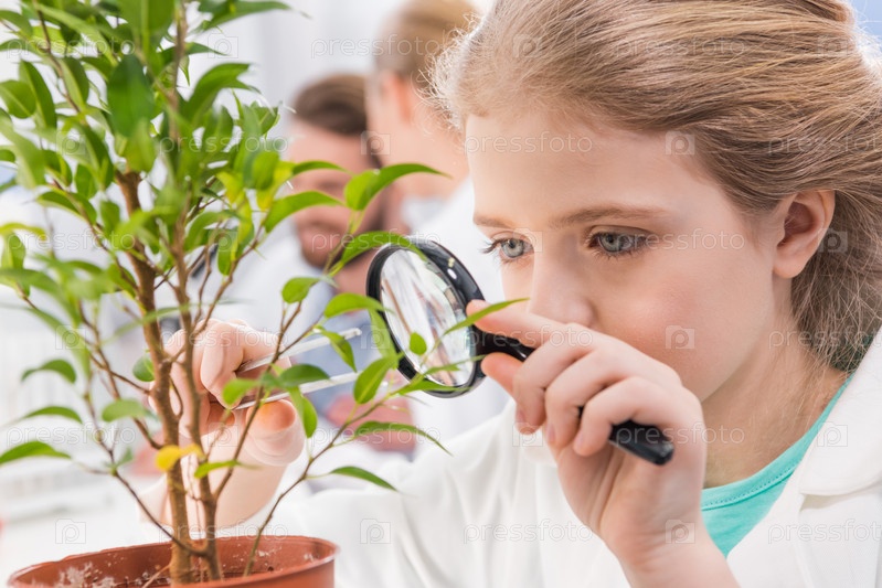 Маленькая девочка с увеличительным стеклом и растением в лаборатории