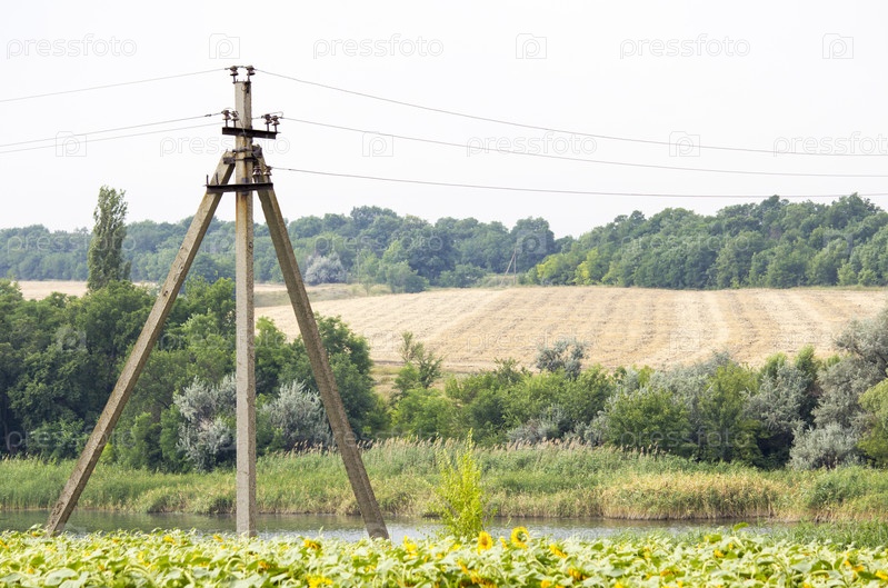 Старый электрический столб на поле с подсолнухами