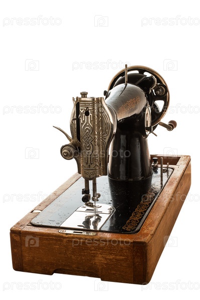 Старая швейная машина на белом фоне
