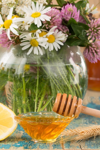 Свежий мед и цветы на столе