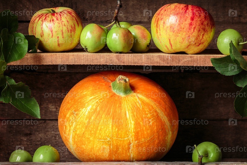 Тыква и свежие яблоки на деревенском столе