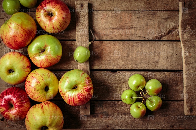 Свежие яблоки на старой коробке