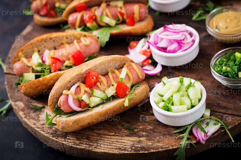 Хот-доги с огурцами, помидорами и красным луком на деревянном фоне
