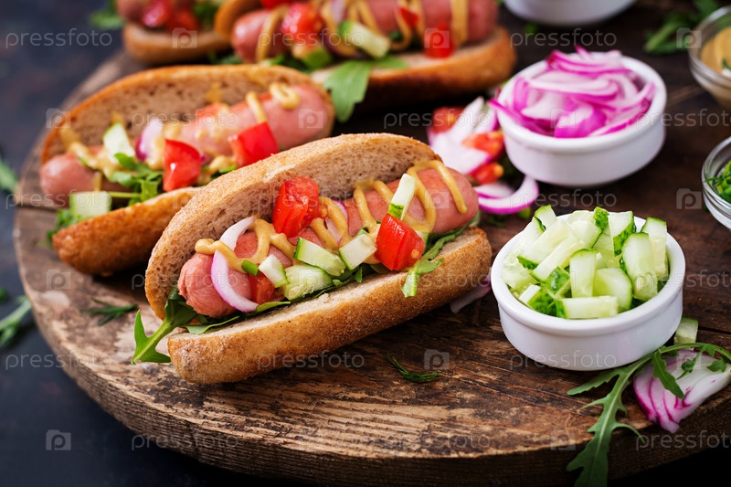 Хот-доги с огурцами, помидорами и красным луком на деревянном фоне