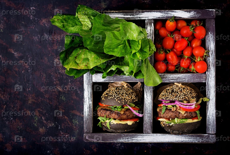 Черные гамбургеры с сочной говядиной, сыром, помидорами, красным луком