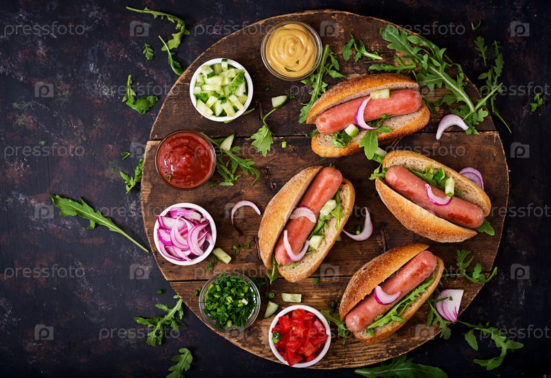Хот-доги с огурцами, помидорами и красным луком на деревянном фоне
