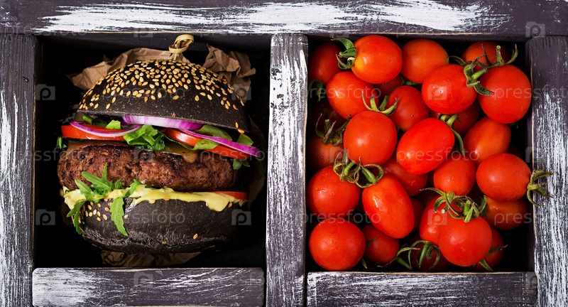 Черные гамбургеры с сочной говядиной, сыром, помидорами, красным луком