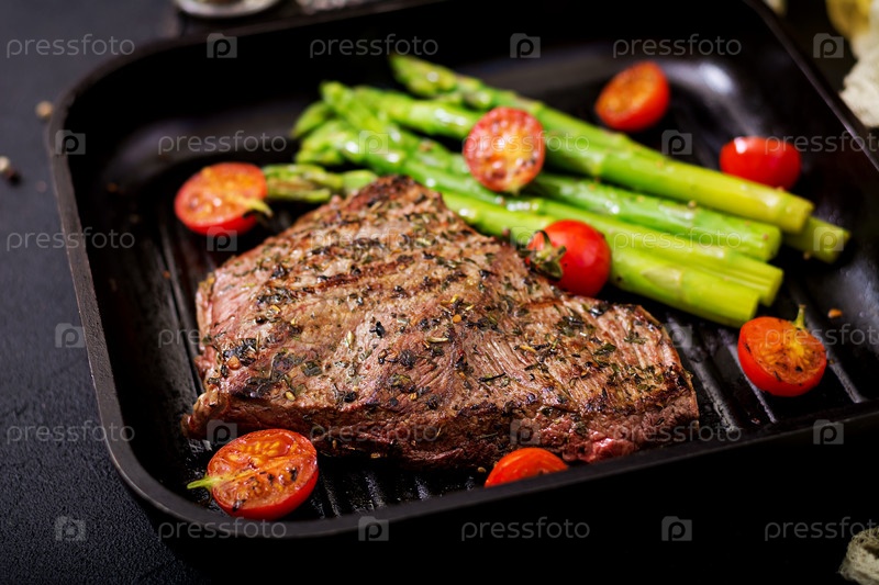 Сочный стейк из говядины на деревянной доске с гарниром из спаржи