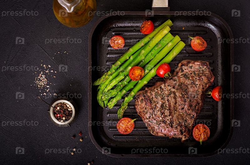 Сочный стейк из говядины на деревянной доске с гарниром из спаржи