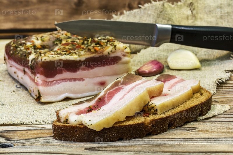 Два кусочка соленого сала на черном хлебе с чесноком и луком