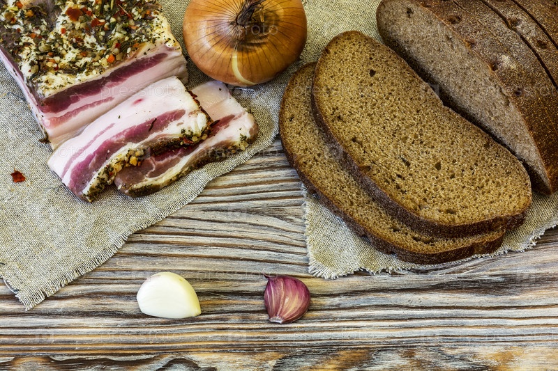 Соленое сало с хлебом, луком и чесноком