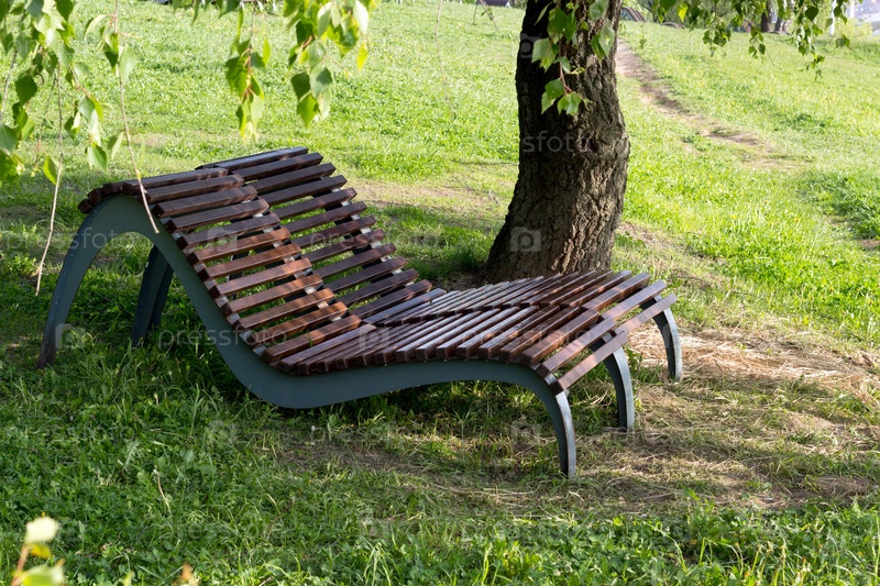 Деревянные лежаки под тенистым деревом в парке