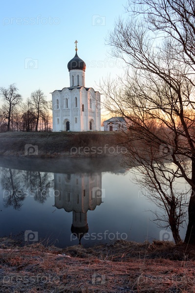 Традиционная православная церковь в лучах первого весеннего солнца, Нерль, Россия
