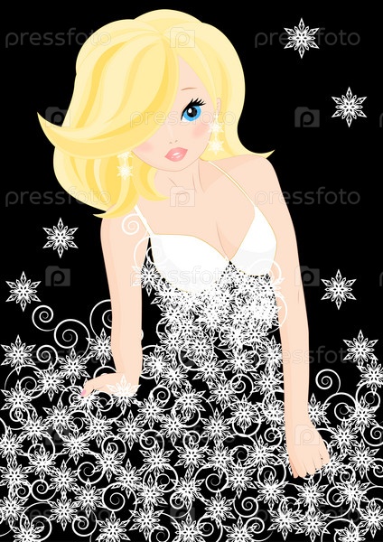 девушка; женщина; снежинка; снежная дева; снежная королева; фон; новый год; рождество; праздник; принцесса; прическа; мода; модель; белый; синий; красота; любовь; очарование; платье; роскошь