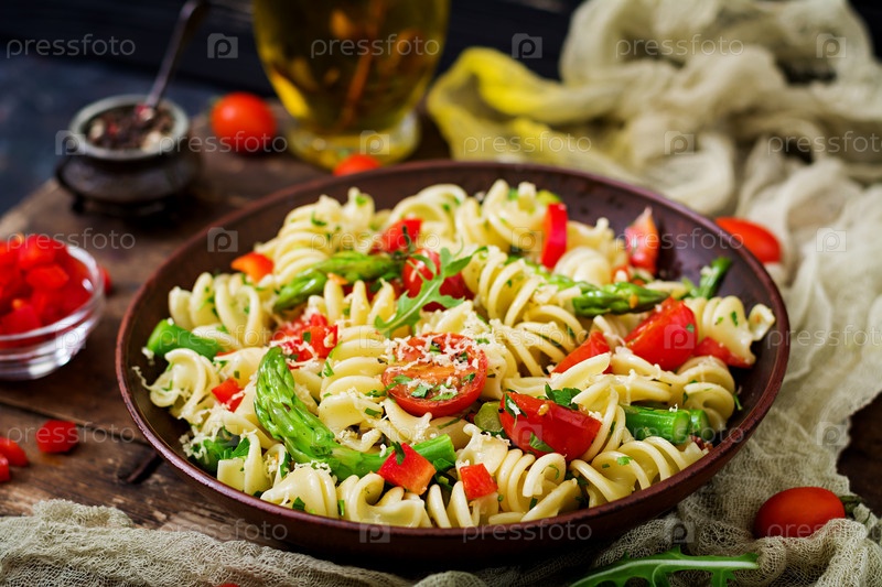 Салат с фузилли, помидорами, спаржей и сладким перцем