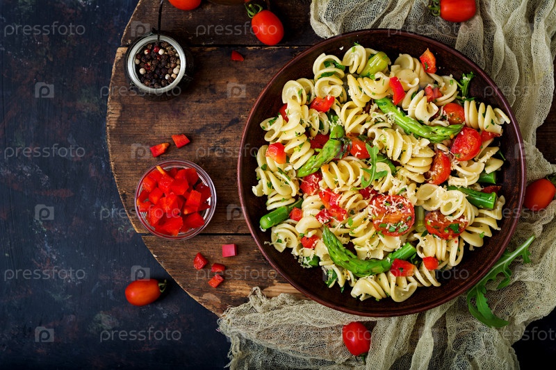 Салат с фузилли, помидорами, спаржей и сладким перцем
