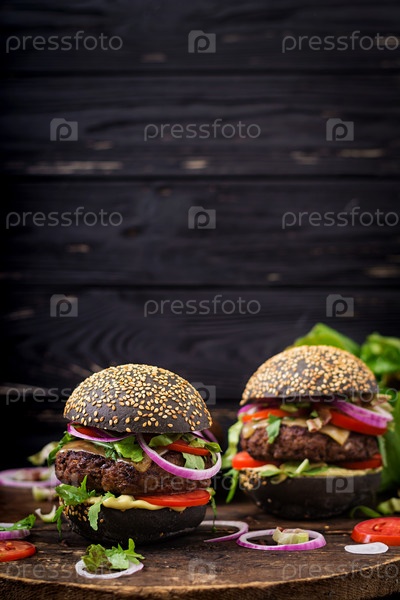 Черные гамбургеры с сочной говядиной, сыром, помидорами, красный лук на черном фоне