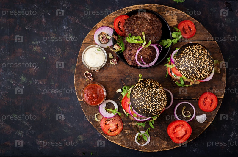 Черные гамбургеры с сочной говядиной, сыром, помидорами, красный лук на черном фоне