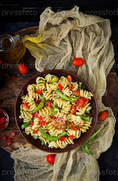 Салат с макаронами фузилли, помидорами, спаржей и сладким перцем