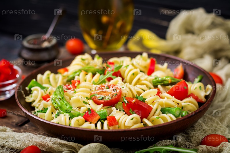 Салат с макаронами фузилли, помидорами, спаржей и сладким перцем