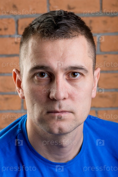 Портрет человека в синей футболке на фоне кирпичной стены