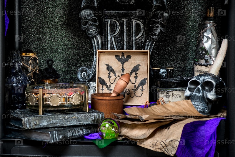 Стол с ритуальным реквизитом в комнате колдуньи