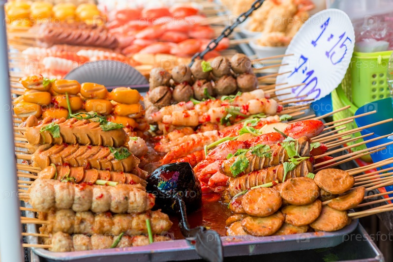 Вкусные сосиски на гриле на улице в Таиланде
