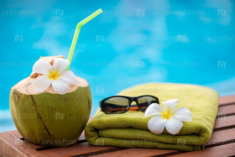 Коктейль на краю бассейна и полотенце с тропическими цветами