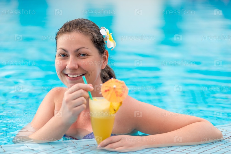 Женщина в бассейне, наслаждаясь коктейлем