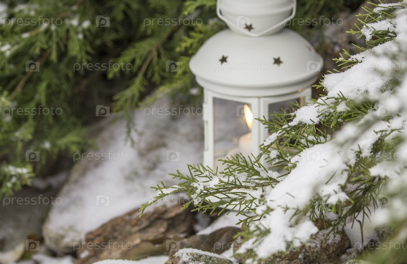 Красивый белый фонарь в снегу