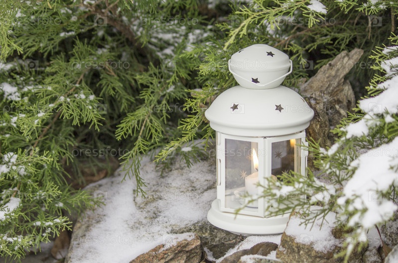 Красивый белый фонарь в снегу