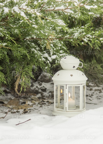 Красивый белый фонарь в снегу