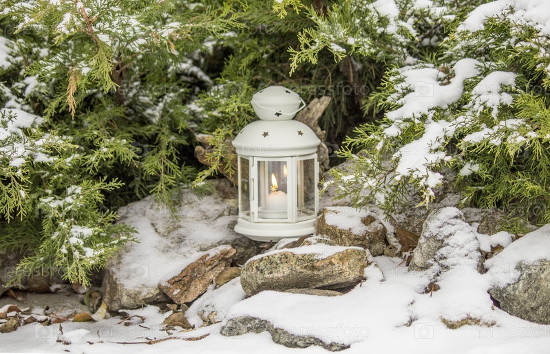 Красивый белый фонарь в снегу