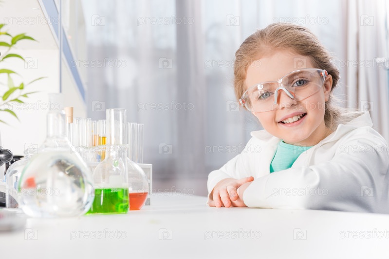 Очаровательная маленькая девочка в очках в лаборатории