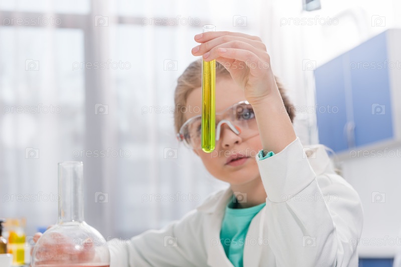 Очаровательная маленькая девочка в очках в лаборатории