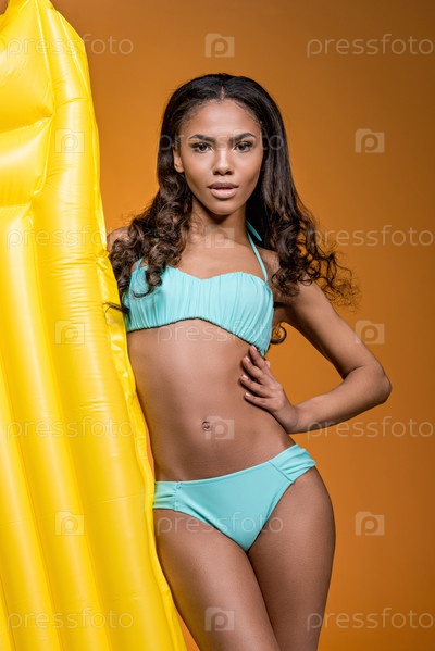 Афроамериканка с плавательным матрасом