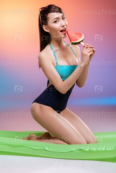 Красивая азиатская девушка в купальнике держит ломтик арбуза на палочке