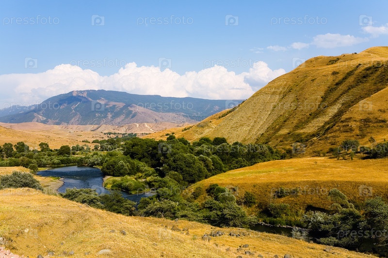 Горный пейзаж и река, протекающая по ущелью
