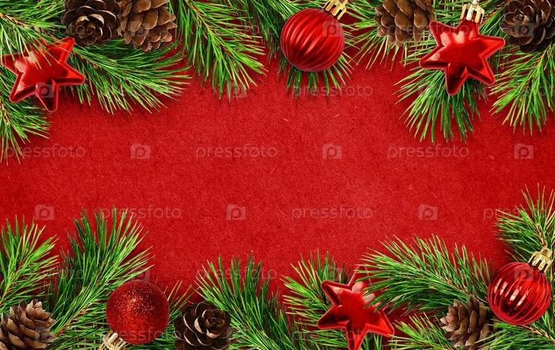 Праздничный фон с елочными веточками, шишками и шарами