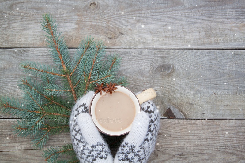 Вязаные шерстяные варежки с чашкой кофе