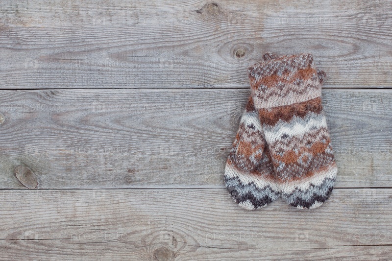 Вязаные белые шерстяные варежки на старом деревянном фоне