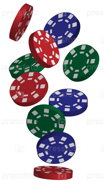 Падающие красные, синие и зеленые покерные фишки, изолированные на белом фоне