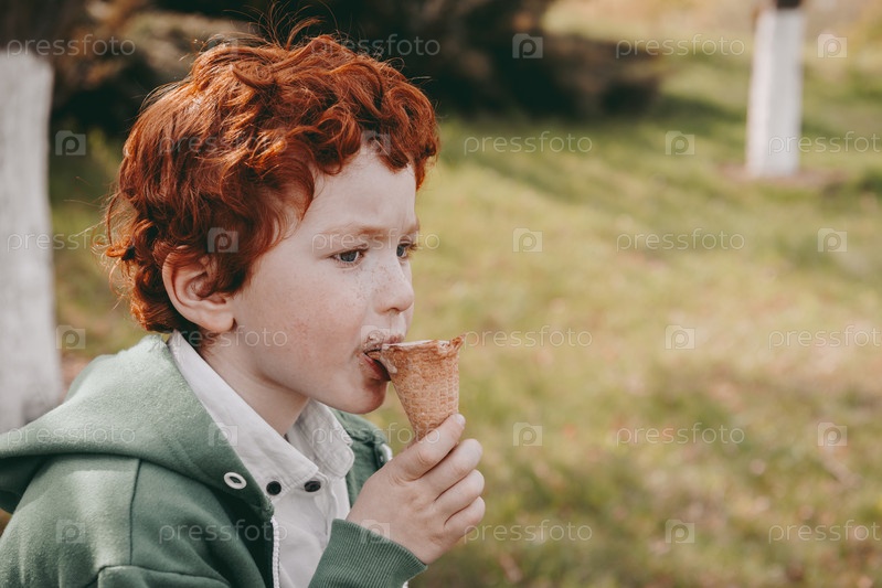 Мальчик кушает мороженое