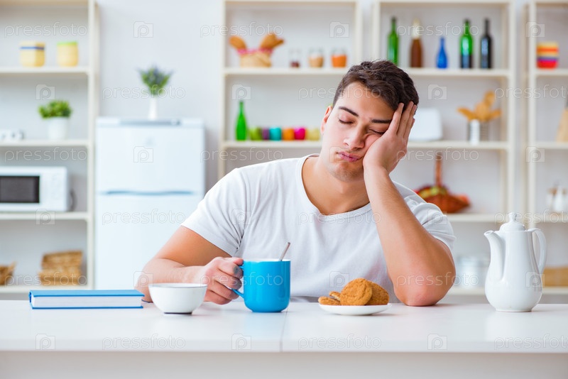 Сонный мужчина за завтраком
