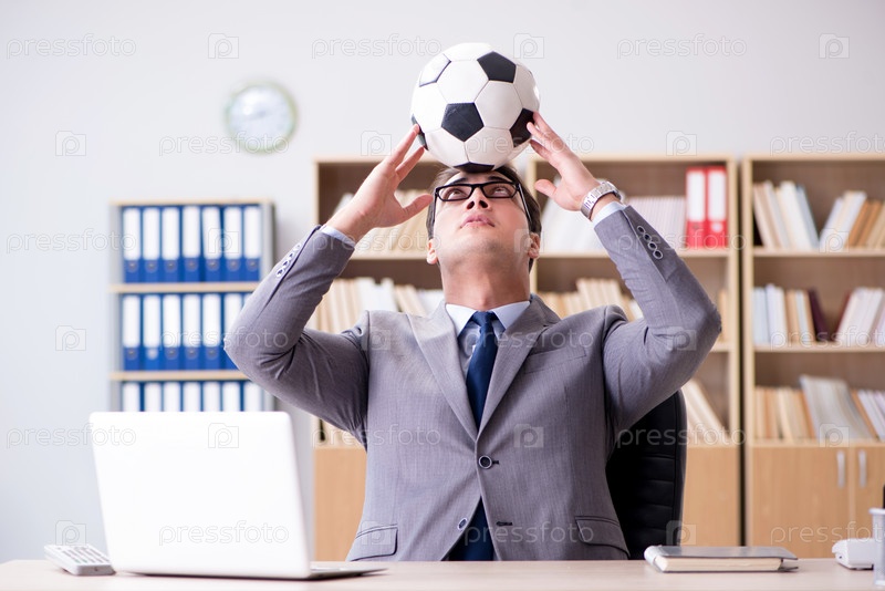 Бизнесмен с футбольным мячом в офисе