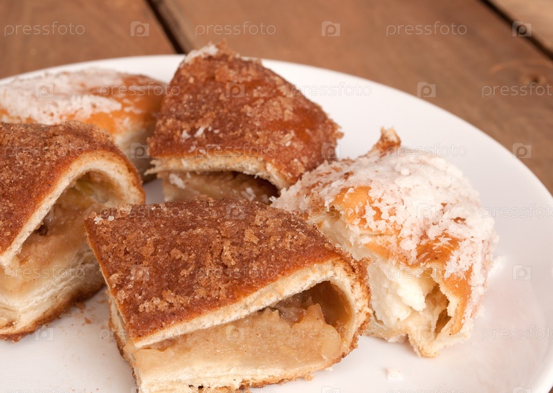 Нарезанный яблочный пирог и пирог с творогом на тарелке на деревянном столе