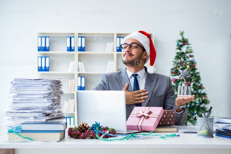 Молодой бизнесмен празднует Рождество в офисе